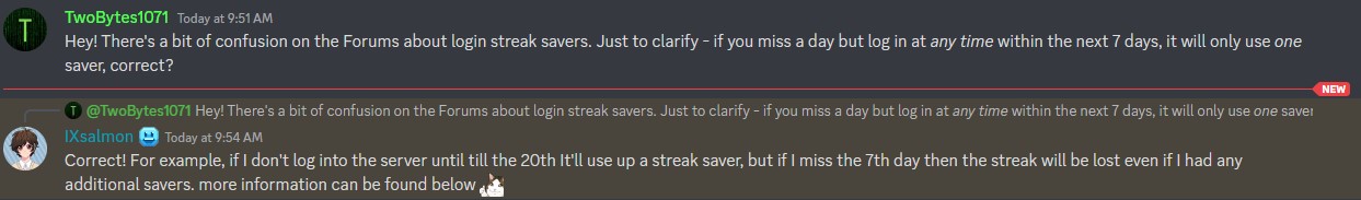 Moving on to the idea to have a maximum of 3 login streaks, I feel it is a good length as there are so many justifiable reasons why someone may not be on for a week, and even with that weeklong gap you still have to be on for atleast 50 days without using a saver anyway, so you still show dedication to the game nonetheless. Having that barrier for safety when reaching a sentimentally high number on your login streak is warranted, and anyway, you can only use one login saver for a single instance, so it’s not it’s going to be a rare occurance.